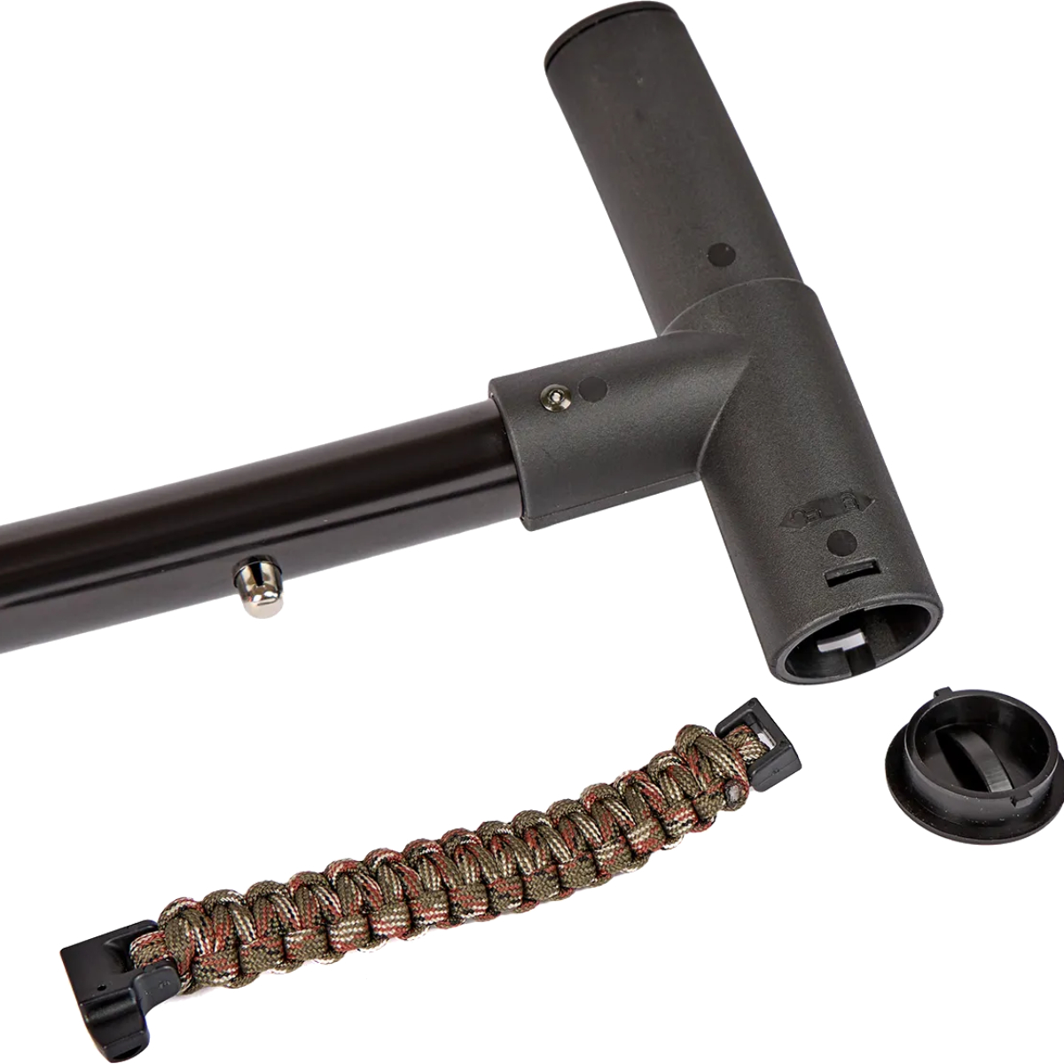 В асимметричной ручке лопаты встроены пластиковый свисток и прочная верёвка, что добавляет ей функциональности и удобства в использовании в различных ситуациях.