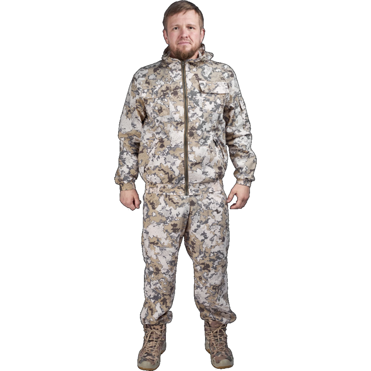 Ткань обработана водоотталкивающей пропиткой WR, что защищает от дождя и брызг. Костюм хорошо вентилируется и подходит для температур до +30°C. Капюшон регулируется по объему, манжеты и низ куртки дополнены широкой эластичной тесьмой, предотвращающей проникновение воздуха и насекомых.