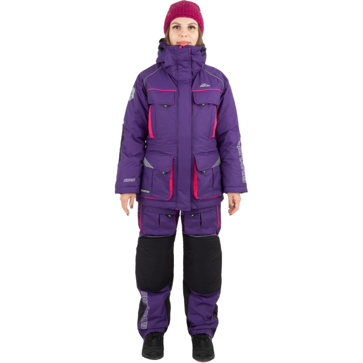 Куртка оснащена многочисленными карманами, вместительным регулируемым капюшоном с козырьком и манжетами на липучках для плотного прилегания. Брюки дополнены лямками с регулировкой по длине и утягивающимся низом, что обеспечивает удобную посадку и защиту от снега и ветра. Костюм идеально подойдёт для женщин, ценящих тепло, комфорт и надёжность в любых погодных условиях.
