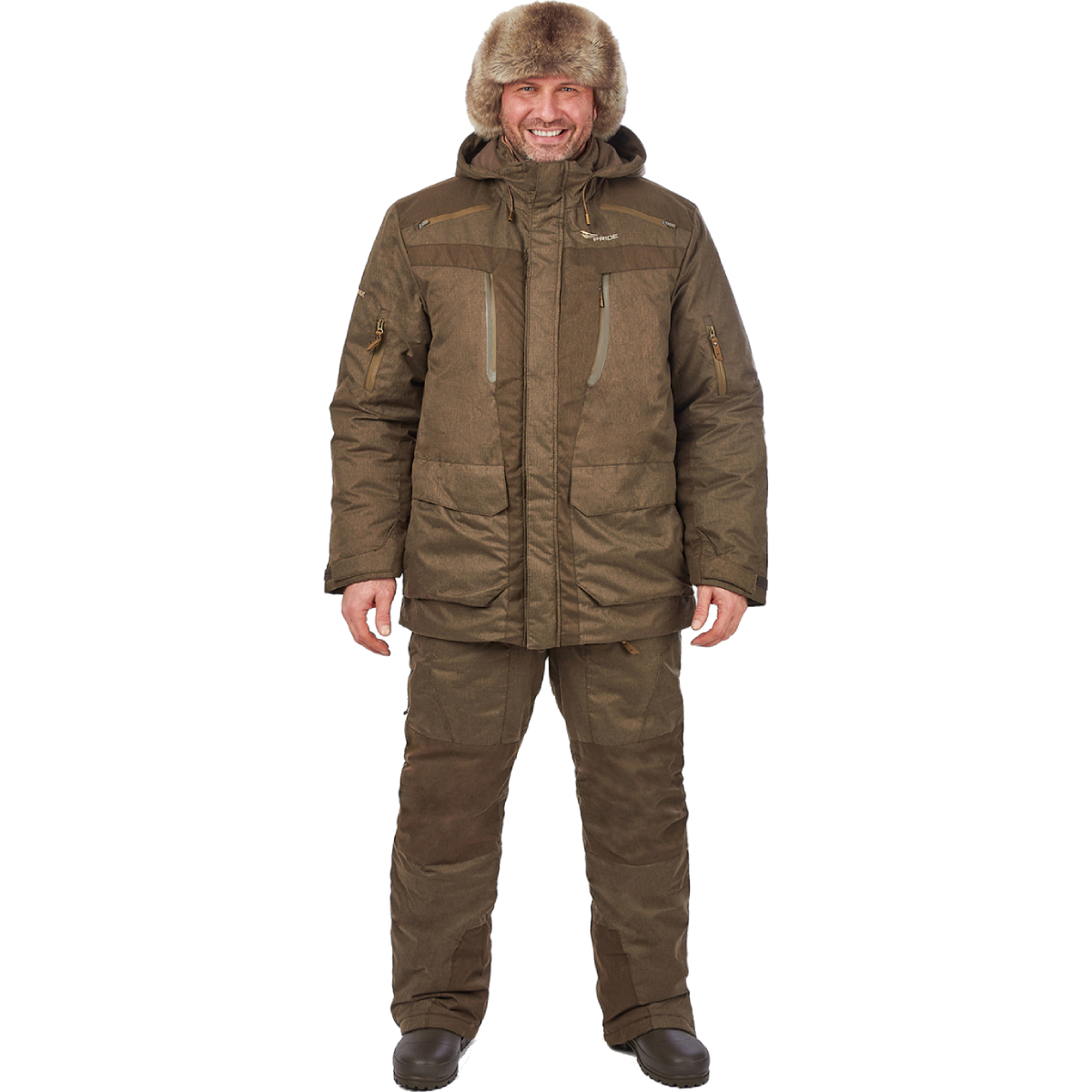 Костюм выполнен из бесшумной мембранной ткани «Бавария», а швы обработаны нитями WR для защиты от влаги. Внутри используется подкладка из вельбоа, обеспечивающая теплоизоляцию, отведение влаги и комфортное сочетание с термобельем или утепляющими слоями благодаря гладкой структуре. Дополнительно в утепляющем пакете применена ткань с металлическим напылением для сохранения тепла. В движении костюм комфортен до -35°C, в статике — до -20°C.