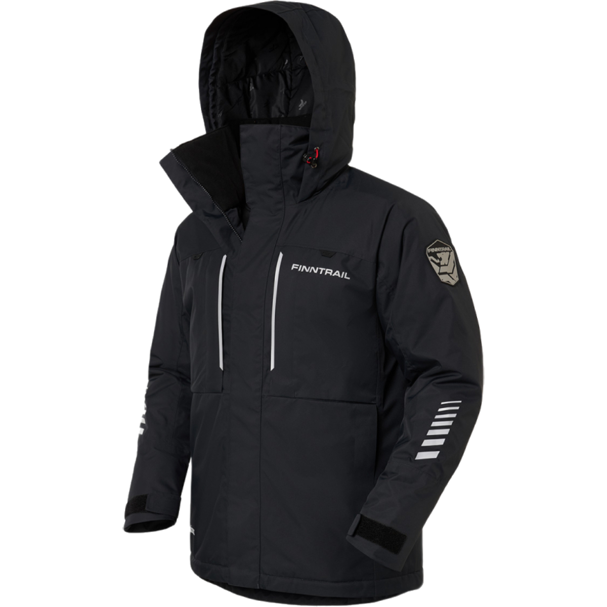Для удобства хранения предусмотрены четыре внешних кармана с тёплой подкладкой (два нагрудных и два боковых) и два внутренних кармана, включая один на молнии с отверстием для наушников. Куртка оснащена снегозащитной юбкой, резиновыми элементами для крепления снастей и мелкого инструмента, страховочным кольцом для снегохода, а световозвращающие элементы повышают безопасность в тёмное время суток. Модель подходит для зимней рыбалки, катания на снегоходе и других активностей на свежем воздухе.
