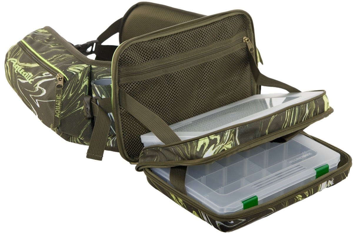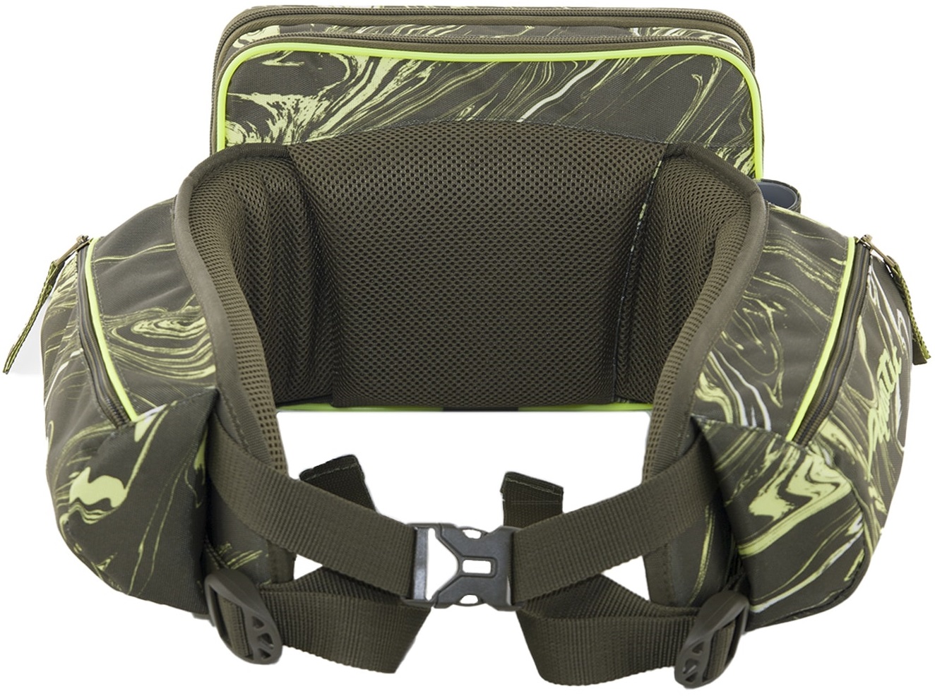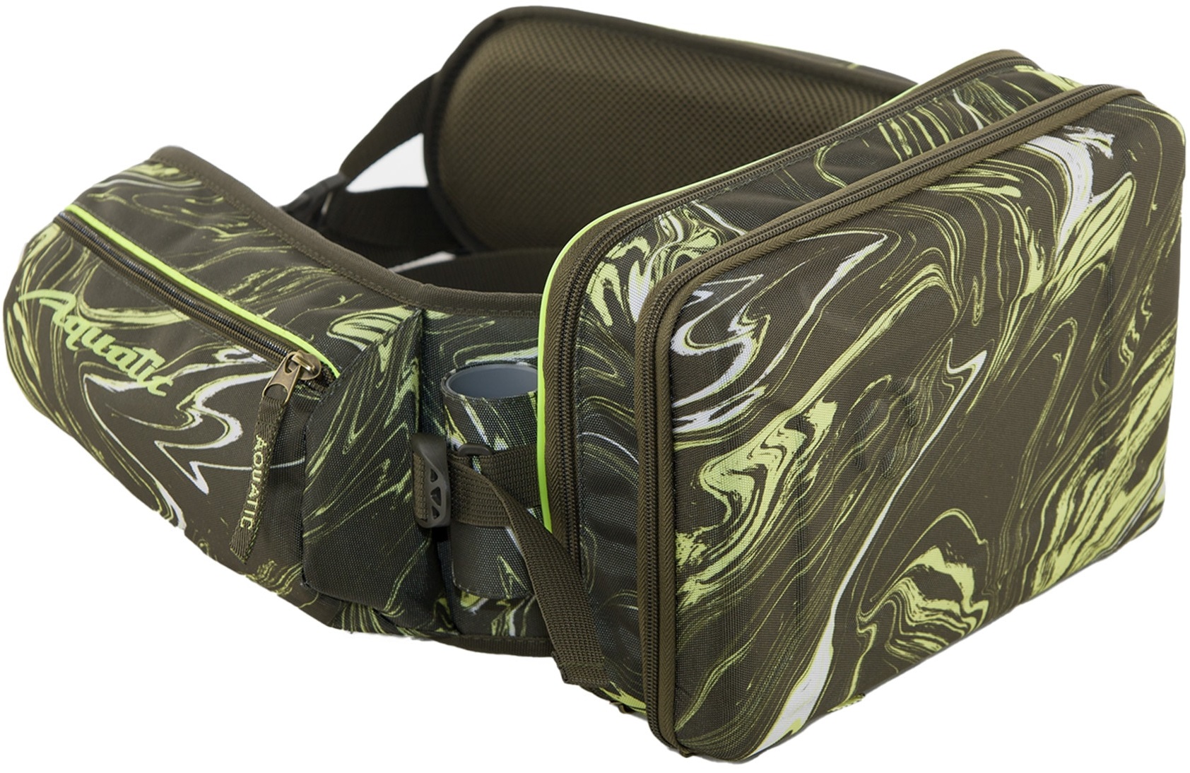 Пояс имеет жесткий стакан для удилищ и два объемных кармана для аксессуаров. На поясе применены светоотражающие элементы. Жесткость самого пояса обеспечивает лист эвапоры, а мягкость специальный поролон с низким коэффициентом памяти и водопоглощения.