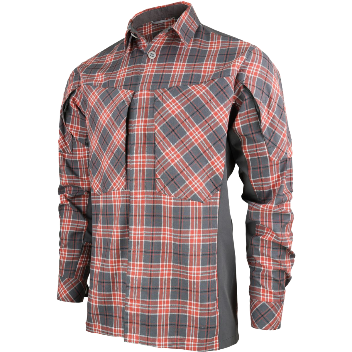 Улучшенный крой с классическим воротником и длинными рукавами дополнен эластичными боковыми вставками и дышащими панелями в области подмышек для лучшей вентиляции. Застёжка на борту и манжетах скрыта канадскими пуговицами, придавая рубашке аккуратный внешний вид.