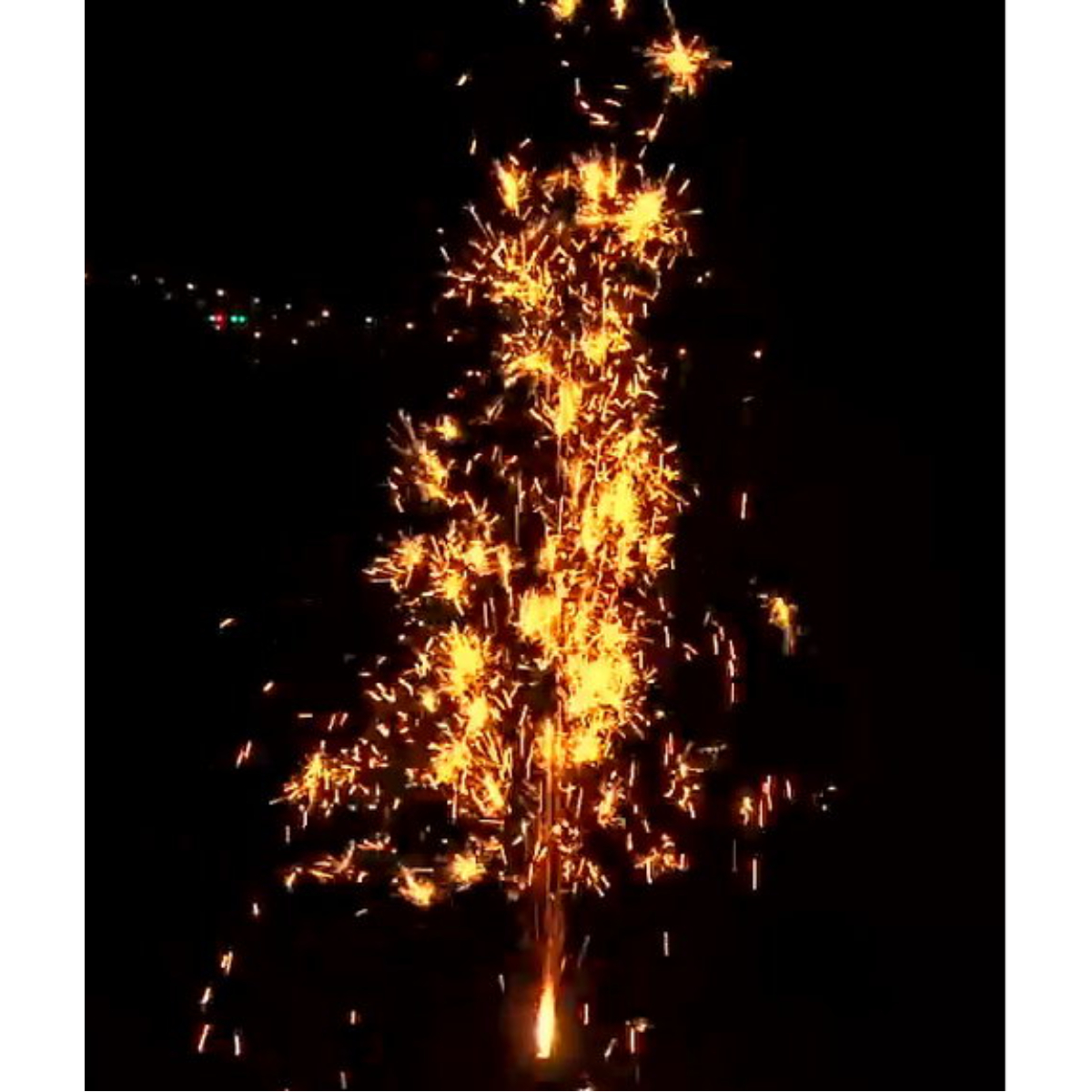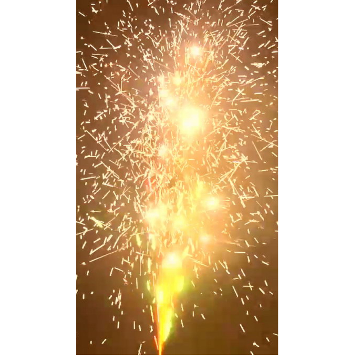В начале фонтан выпускает поток золотых порхающих искр, напоминающих танцующие огоньки. Затем сменяется каскадом серебряных шуршащих искр, которые красиво разлетаются в стороны, добавляя динамики. Завершающий этап сопровождается мощным потоком трещащих серебряных огоньков, создающих громкий и яркий финал.