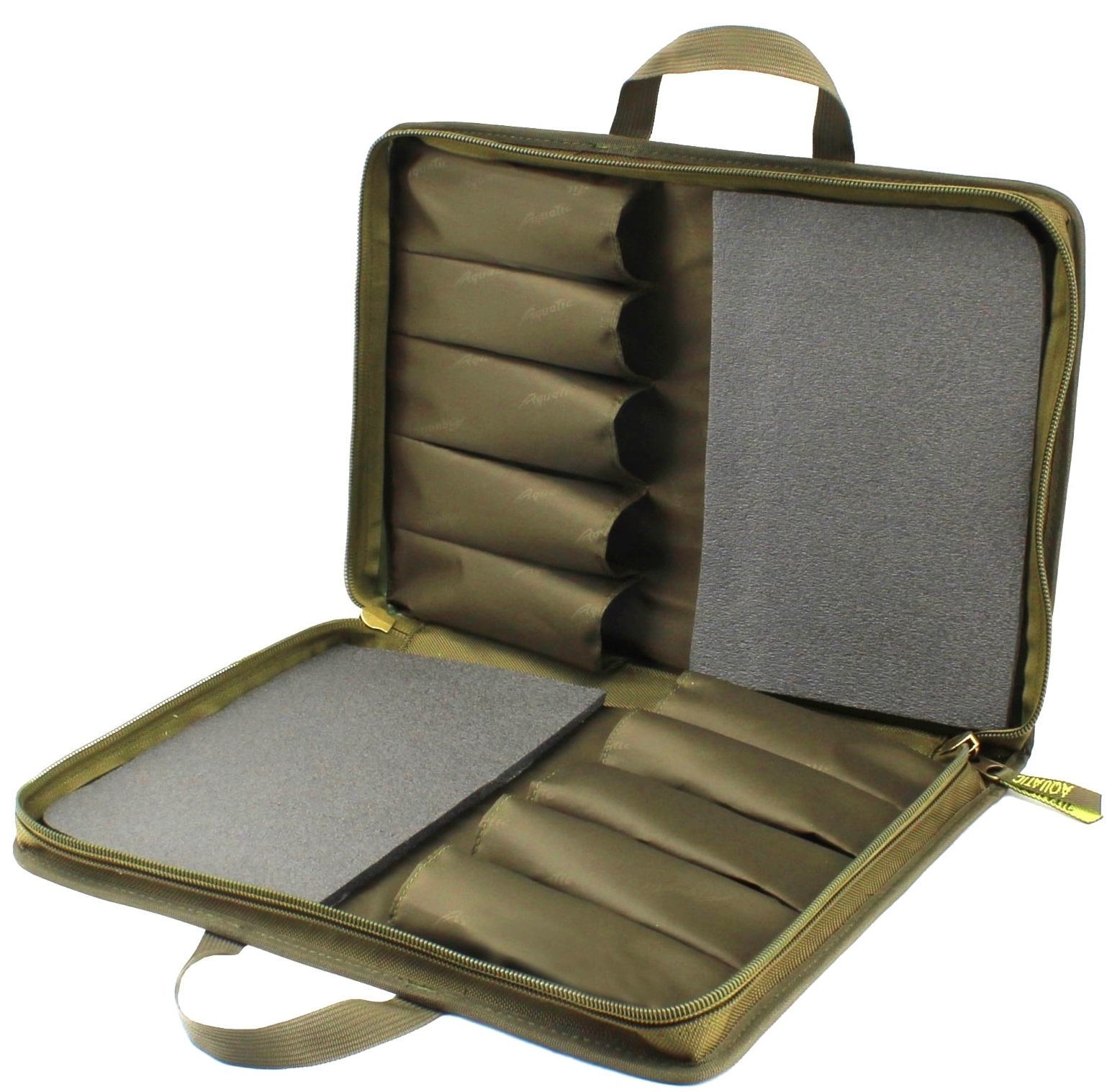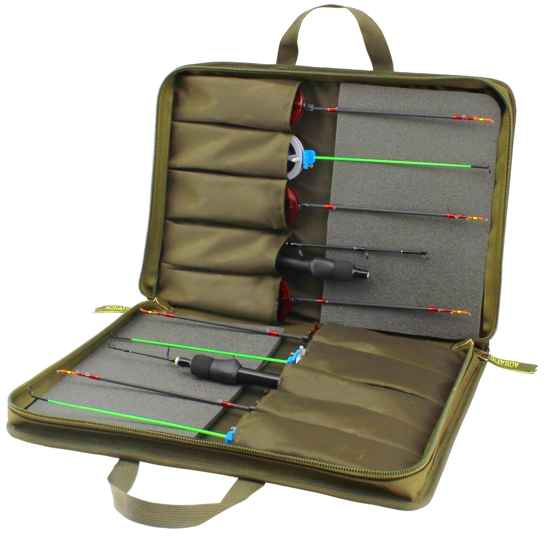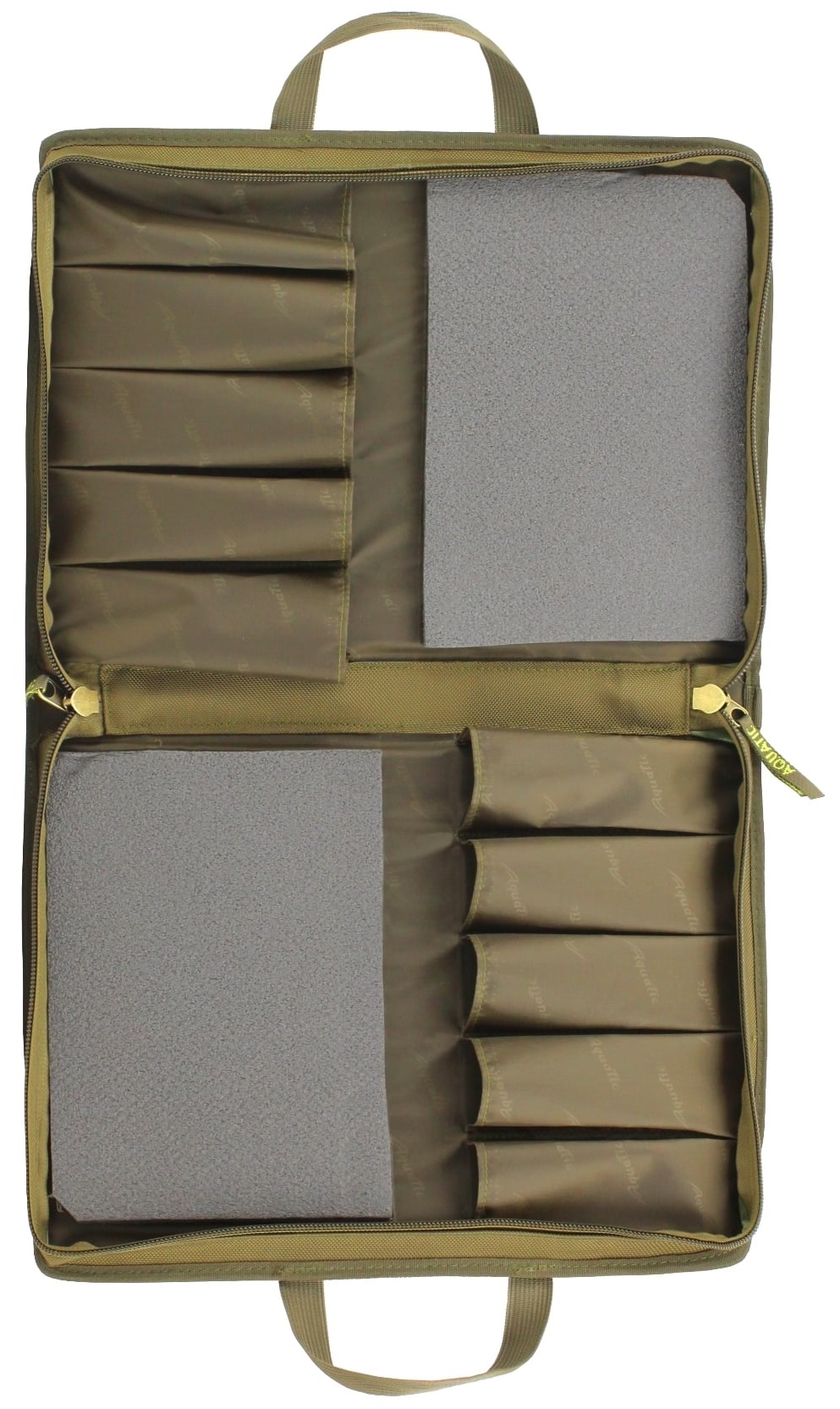 На каждой стороне чехла расположены по 5 отделений из нейлона для фиксации удилищ и мягкие вставки из пены для сохранности хлыстиков.