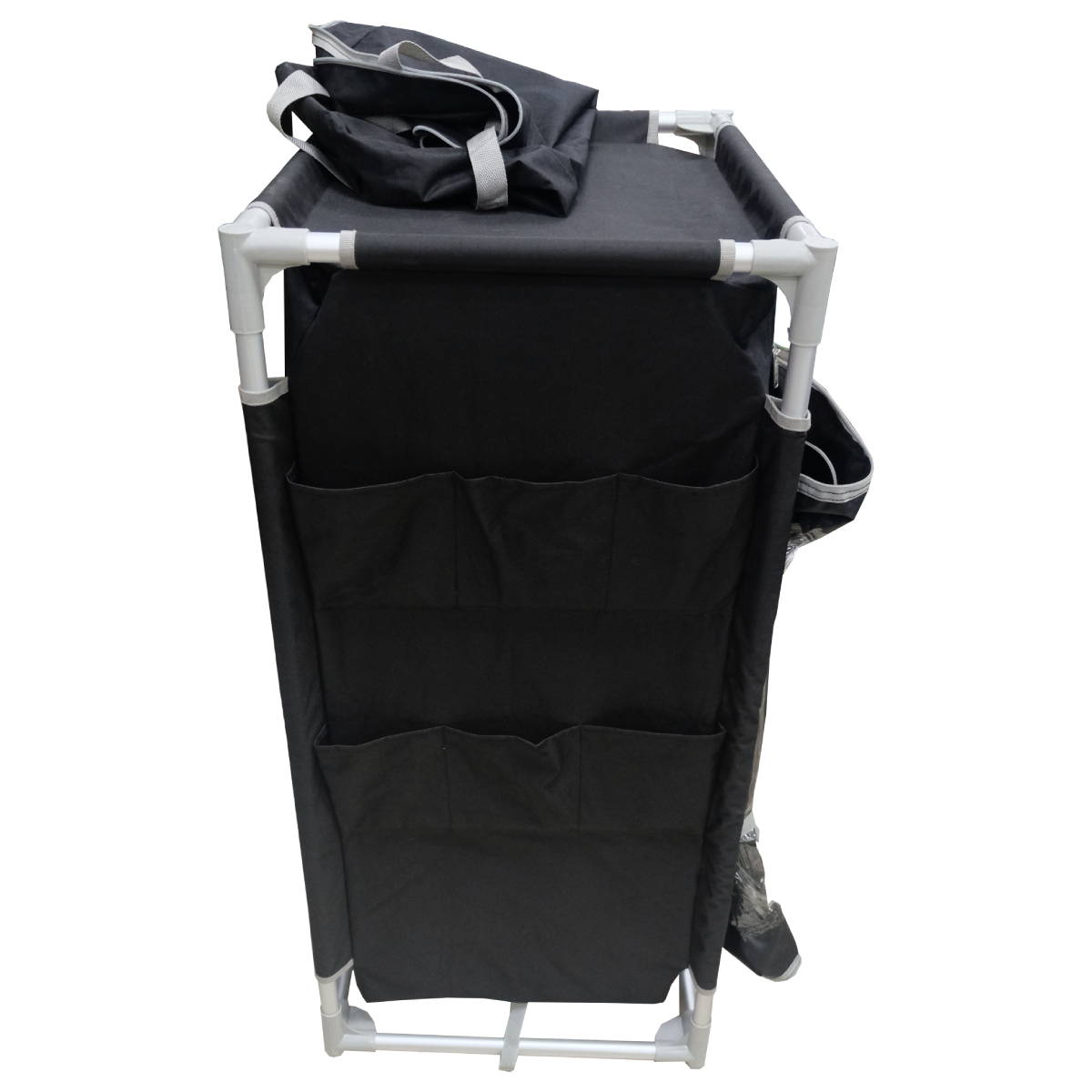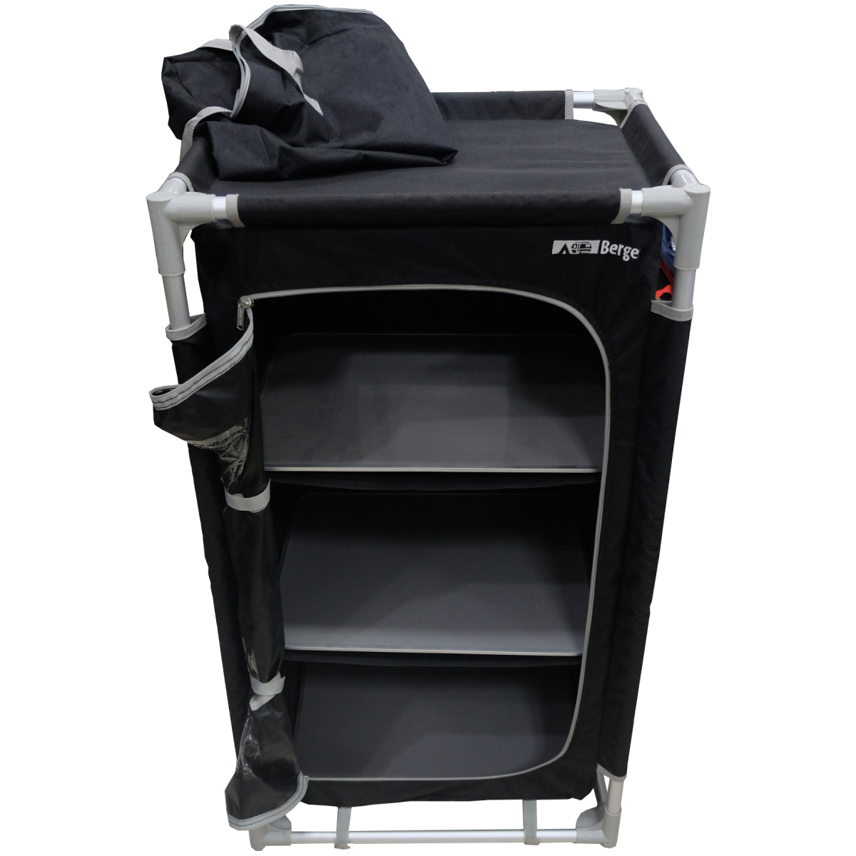Шкаф оснащен несколькими полками и карманами, что обеспечивает удобную организацию пространства для хранения одежды, посуды, продуктов и других мелочей.