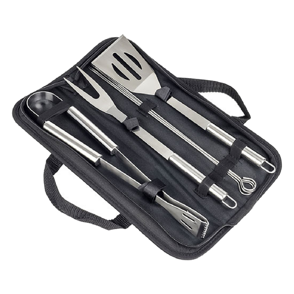 В комплект входят: чехол, лопатка, щипцы, 4 шампура и вилка для мяса.