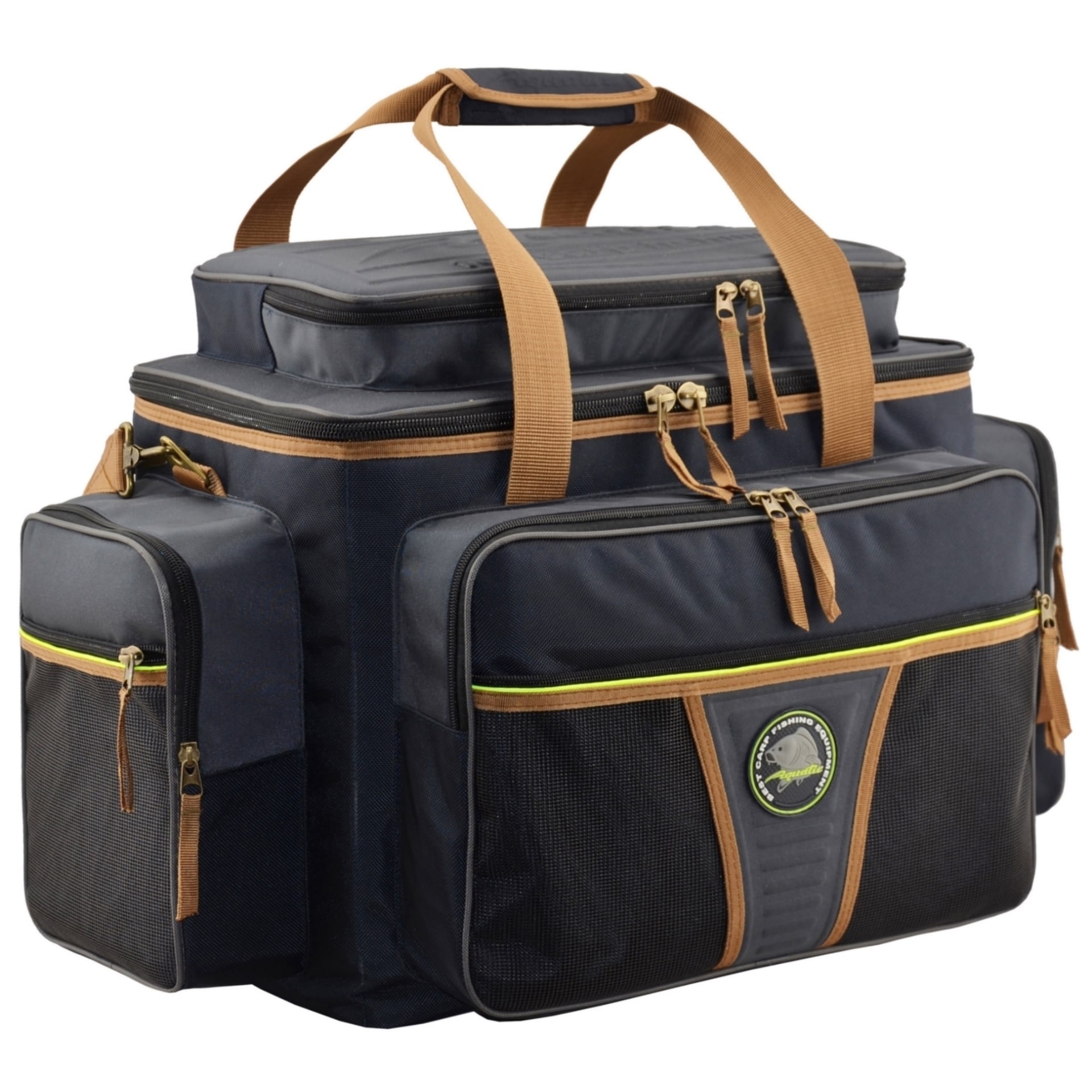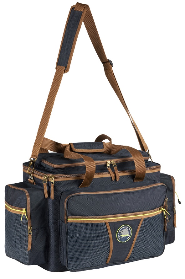 Сумка укомплектована сумкой для кормушек, грузил и так далее. Изготавливается сумка из непромокаемых тканей повышенной прочности, имеет 3 объемных накладных кармана дублированных карманами из сетки. В сумке имеются дополнительные карманы для сигнализаторов поклевки и других дополнительных аксессуаров.